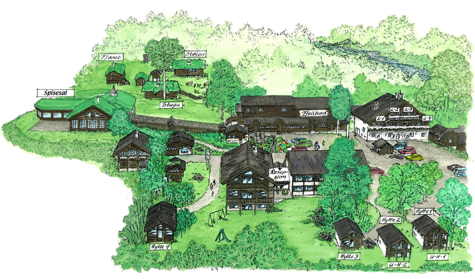 Våre 7 hytter er rundt hotell bygget, det er fire hytter foran hotellet, og tre hytter bak spisesal.