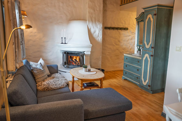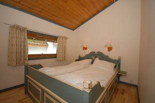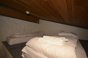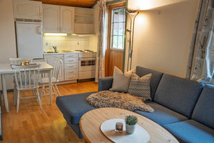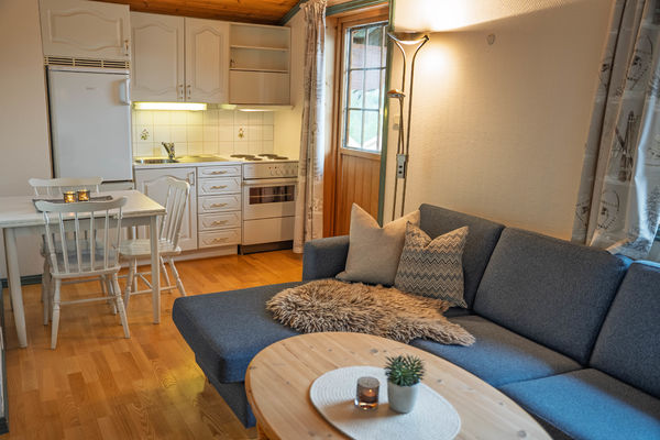 Leiligheten har ett soverom med dobbeltseng og en hems med to madrasser. Badet er utstyrt med boblebad, og i den kombinerte stuen og kjøkkenet finnes en liten sofagruppe, spisebord med tre stoler og peis. Herfra har du også utgang til en koselig balkong med utsikt over tunet på Hermon.